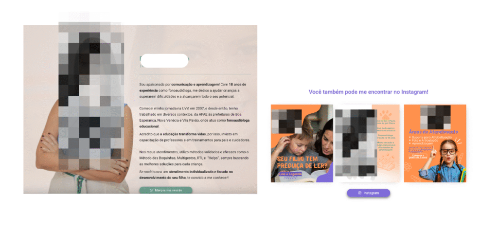 Site Fonoaudióloga Todos os sites são de clientes reais e para sigilo da imagem todas as imagens pessoais, nomes e logos foram censurados. Voltar para o Site Entar em contato!