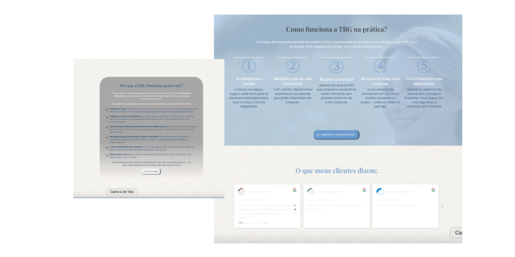 Site Terapeuta TRG Todos os sites são de clientes reais e para sigilo da imagem todas as imagens pessoais, nomes e logos foram censurados. Voltar para o Site Entar em contato!